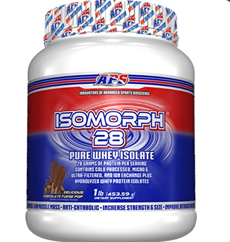 Studio : APS Publisher : APS Binding : Health and Beauty Product Description APS IsoMorph Pure Whey Protein Isolate 1Lb Chocolate Fudge. IsoMorph 28 Pure Whey Isolate is the end-all, be-all AAA-rated whey protein isolate product. In fact, it's not just a whey protein isolate-it is 4 ultra-pure whey protein isolate, including hydrolyzed whey protein isolate. APS manufactures IsoMorph 28 pure whey isolate in our GMP facility. We guarantee this to be the purest and freshest whey protein isolate available anywhere. Over 90% of the companies that sell protein don't actually manufacture it; they're just marketers. At APS Nutrition, we manufacture our protein in our own GMP facility, so we control all aspects of the manufacturing process from start to finish. 0