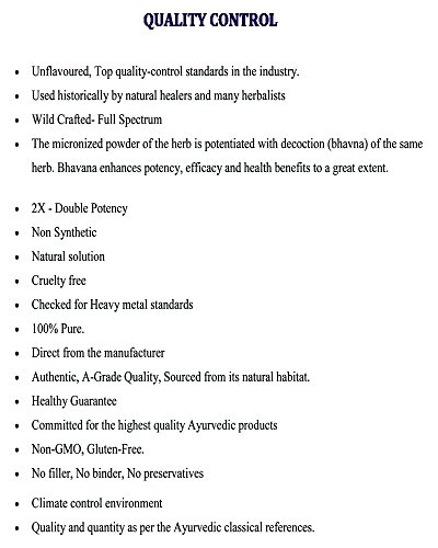 Non-GMO, Raw herb powder, Gluten-Free, Vegetarian. Sun shadow dried with green house technology.Wild Crafted - Full Spectrum. The product is prepared as per traditional Ayurvedic standards. This means the micro pulverized powder of the herb impregnates with its own juice or decoction by trituration (bhavna).