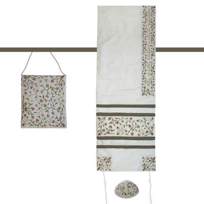 Tallit Prayer Shawl Gadol + Bag + Kippah + Atara Set - Yair Emanuel EMBROIDERED RAW SILK FLOWERS WHITE (Bundle)