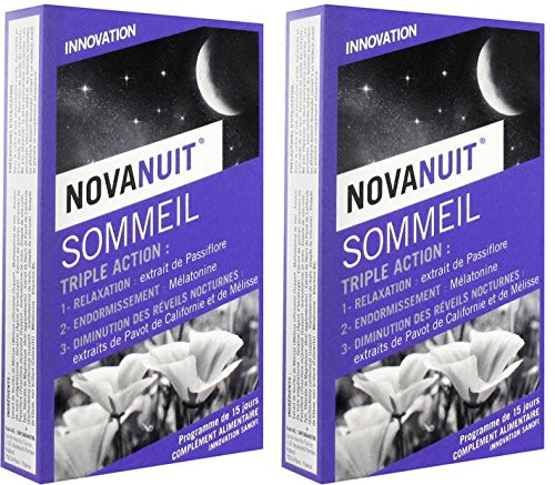 -. Binding : Health and Beauty -. Brand : NovaNuit -. EAN : 3582910072621 -. Feature : All Natural Sleep Aid - Triple Action / Novanuit is the most popular, top selling sleep aid in France. / Action 1 - Action relaxing with passion flower extract, 100% vegetable / Action 2 - Action on the sleep phase by Melatonin helps reduce sleep latency. The effectiveness is proved by taking 1 mg before bedtime. / Action 3 - Action on sleep quality in a decrease in nocturnal awakenings, thanks to extracts of California poppy and lemon balm, 100% of vegetable origin. -. Label : NovaSante -. Manufacturer : NovaSante -. MPN : NOVAN-SC602P-0215 -. PackageQuantity : 2 -. PartNumber : NOVAN-SC602P-0215 -. ProductGroup : Health and Beauty -. ProductTypeName : HEALTH_PERSONAL_CARE -. Publisher : NovaSante -. Studio : NovaSante -. Title : NovaNuit 100% All Natural Herbal Sleep Aid Fall Asleep Fast With No Harsh Side Effects - #1 Natural Sleeping Pill in France - Non-Habit Forming - Eliminate Insomnia - 30 Vegetarian Capsules - Triple Action: Relaxation - Sleep - Nocturnal Wakenings (2 Packs - 60 capsules)