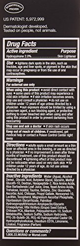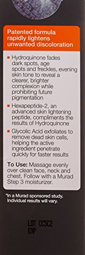 -. Binding : Health and Beauty -. Brand : Murad -. EAN : 0767332100739 -. Feature : Hydroquinone fades existing dark spots, age spots and freckles / Hexapeptide-2, an advanced skin lightening peptide, complements the results of Hydroquinone and prevents future damage by helping prohibit pigment formation / Glycolic Acid exfoliates to remove dead skin cells, helping the active ingredient to penetrate more quickly for faster results -. Label : Murad -. Manufacturer : Murad -. Model : 10073 -. MPN : 10073 -. NumberOfItems : 1 -. PackageQuantity : 1 -. PartNumber : 10073 -. ProductGroup : Beauty -. ProductTypeName : HEALTH_PERSONAL_CARE -. Publisher : Murad -. Studio : Murad -. Title : Murad - Rapid Age Spot and Pigment Lightening Serum 1.0 fl oz -. UPC : 767332100739