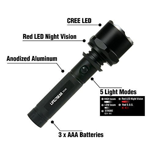 Life Gear Pro Series 120 Lumen CREE LED High Grade Aluminum Flashlight, Red Night Vision and SOS, Black, LG21-60544-BLA
