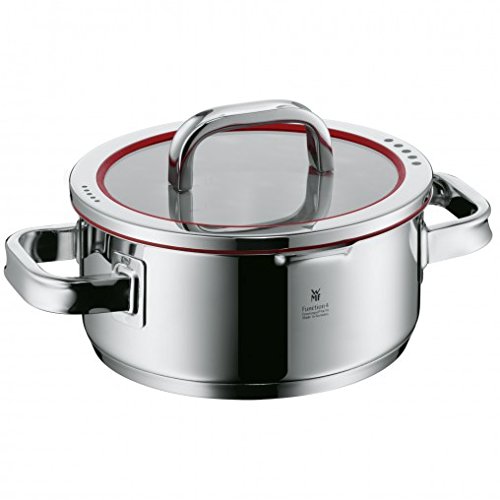 The function four set includes a 2.5 qtr. covered casserole, a 2 qtr., 4 qtr. and 6 qtr. casseroles with lids. The lids are what sets this set apart. Made from 18/10 stainless steel, glass and Red silicone - they allow for four different functions: closed for steaming, boiling and a quick cook; open for allowing steam to escape while cooking and draining off cooking liquids; and a large and small sieve for pouring off liquids without losing your ingredients. The pots are made of 18/10 stainless steel with a polished finish, and stay cool handles. They made be used in the oven, although the lids are only heat safe to 300 degrees. The trans-term base ensures even heat distribution and excellent heat retention.Feature