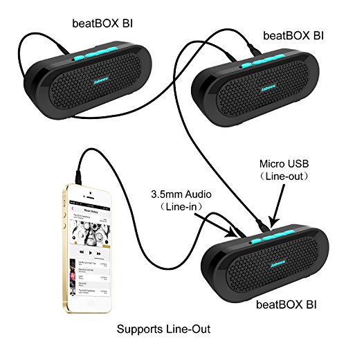 -. Feature : Latest Bluetooth 4.1 Technology - Built for ages 6 and up, simply slide the on/off switch to the "on" position to automatically connect to the last-connected device and start streaming your music - that's just one step. The unit also doubles as a speaker phone with a 2-foot range microphone so you can answer or make calls mid-song. / Full,HD Sound - Enjoy an impressively crystal clear sound quality and robust bass realized through two 3W audio driver, total 6W output. / IP Rated IPX4 designed as a Outdoor Speaker and Shower Speaker - Comes with the unique in-bult bike mount for you to easily have the speaker mounted on the bike's handle bar, golf cart, shower pole or any other similar-sized pole. Never worry about losing the bike mount kit. / Broad Compatibility. -Connect with any Bluetooth-enabled device (Bluetooth 2.1 and over) or just plug in with the traditional audio cable to start your tunes. / Supports Line-out allows you to plug multiple beatBOX BI speakers in a daisy chain or other speakers simultaneously to stream music doubles or trebles or even more loudly.
