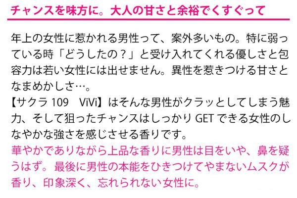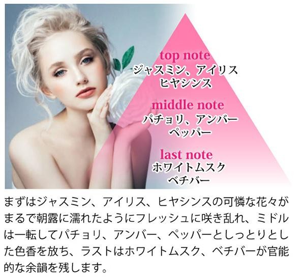 | 人気のサクラシリーズのフェロモンフレグランスジャスミン アイリス ヒヤシンスなど可憐な花々が咲き乱れ さらにしっとりとムスクが香り立つ エレガンスと幸福感に満ちた香りです |