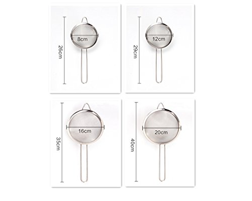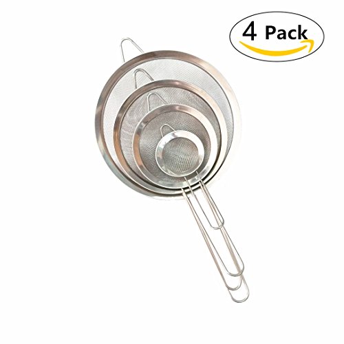- STRAIN ANYTHING YOU WANT: The set of 4 strainers can be used as tea strainer, coffee strainer, or fruit strainer. Pasta, coffee, yogurt, quinoa, flour, rice, salad, oil, noodle, baby cereals, salt, spices, sugar, confectioner's icing, cocoa powder, ground coffee beans and more.