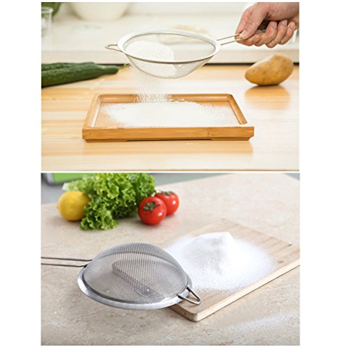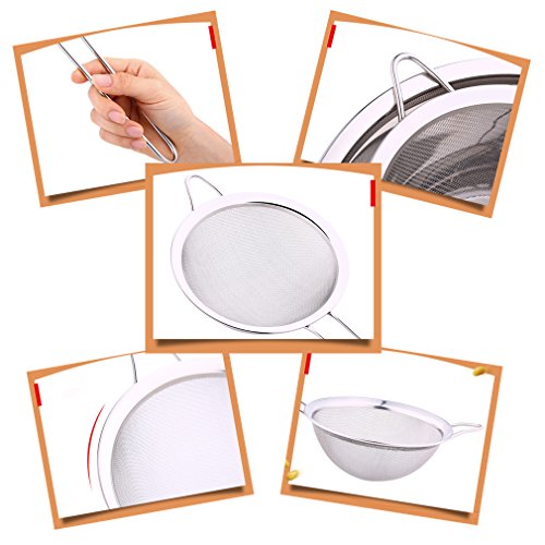 - MATERIAL: The fine mesh strainers are made of 100% stainless steel. Professional quality, stainless steel, no rust guaranteed, sturdy and easy storage. Sieves deliver superior drainage for sifting and straining both wet or dry ingredients.