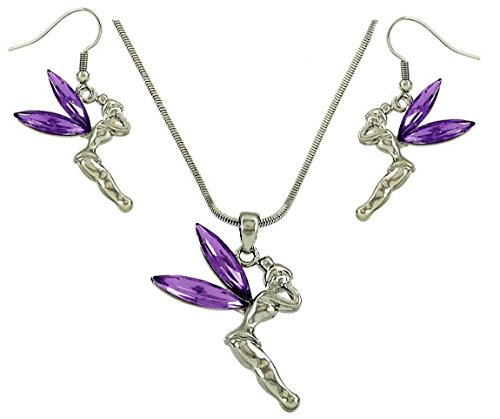 Here is an adorable Disney Fairy Tinkerbell pendant necklace and Earrings Set . This beautiful Tinker Bell has Purple Crystal Wings . The pendant size is about 1" ,earrings are 1", chain is 18". This Beautiful Set comes in a nice Gift Box ready for gift giving .Feature