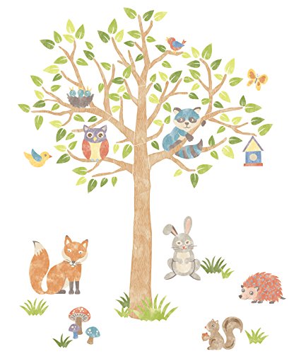 The forest is a magical place. This Woodland Tree is a happy habitat for all kinds of animal friends. The branches of this artful tree host a blue raccoon and jolly owl, along with birds and butterflies. A charming fox, rabbit, porcupine and squirrel frolic playfully nearby, nestled amongst colorful mushrooms and grass on the forest floor. Enchant a whole room with this precious wall art kit, which is totally removable and reusable and will not damage your walls. The Woodland Tree kit comes on two 24" x 36" sheets and contains 87 total pieces.Feature