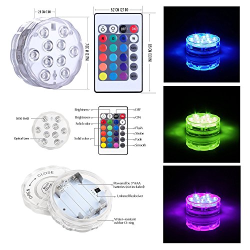 {Battery Powered}:This submersible lights operated by 3 x AAA batteries (Not included)lasts 10-12 hours with qualified dry batteries,its cordless design allow it to put anywhere you need,bulit with 10pcs of super bright multicolor LED lamp beads