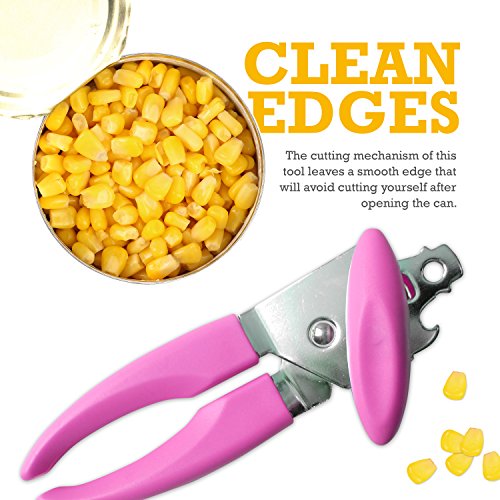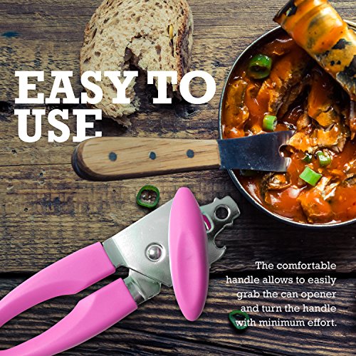 Manual Smooth Edge Pink Can Opener - Best Handheld Portable Ratchet with Bottle and Jar Opener - Easy Hand Crank High Quality Chrome Plated Rustproof Tool - Open Cans with Less Effort Easy Pop