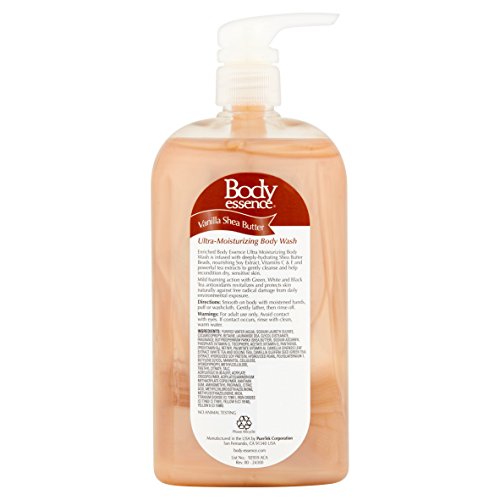 Studio : Body Essence Publisher : Body Essence Binding : Misc. Product Description Vanilla Shea Butter Body Wash Enriched Body Essence Ultra Moisturizing Body Wash is infused with deeply-hydrating Shea Butter Beads, nourishing Soy Extract, Vitamins C E and powerful tea extracts to gently cleanse and help recondition dry, sensitive skin. Mild foaming action with Green, White and Black Tea antioxidants revitalizes and protects skin naturally against free radical damage from daily environmental exposure. Wrap your skin in soothing hydration with enriched Body Essence Ultra-Moisturizing Body Wash. It combines shea butter beads, soy extract, tea extracts and Vitamins A, C and E to gently clean and recondition sensitive, dry skin. The hydrating shea butter beads burst when they come in contact with skin, providing the ultimate skin-softening action. To condition the skin for a finished look and silky feel, soy protein extract was added to the Body Essence Body Wash, 24 oz. To protect the skin against daily environmental exposure, Body Essence Vanilla Shea Butter Body Wash contains green, white and black tea extracts that work with the vitamins to provide antioxidant activity that revitalizes the skin naturally. The convenient pump bottle makes the body wash easy to use in the tub or shower and lathers luxuriously for cleansing. This moisturizing body wash exfoliates while nourishing and hydrating the skin, leaving you smelling clean and refreshed. Warnings: 0