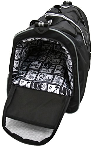 Extra large main compartment holds clothing, workout gear,and personal items * Internal organizational pockets for smaller items * Zippered mesh door pocket * 2 external/expandable pockets with drainage * Dedicated shoe compartment * Detachable shoulder strap for comfortable shoulder or across-body carrying * Back smart panel slides over wheeled luggage handle