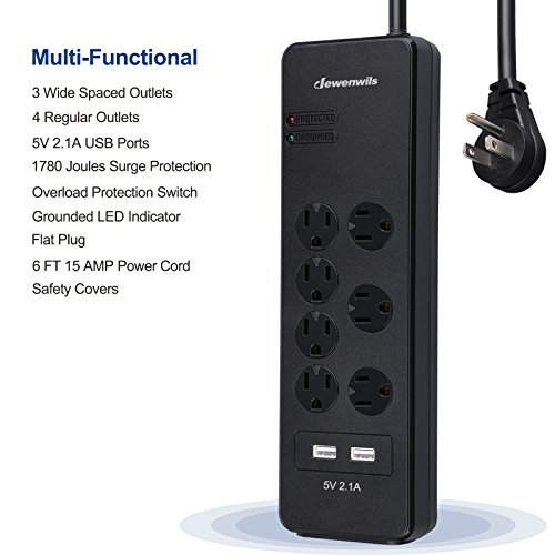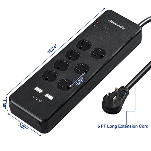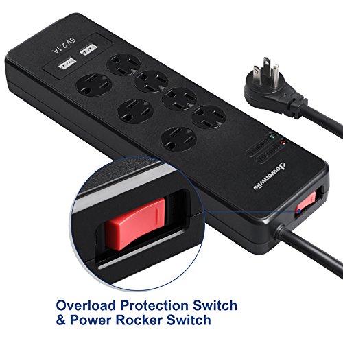 Dewenwils 7-Outlet Surge Protector Power Strip with Right Angle Flat Wall Plug, 2 Smart USB Ports, 6 Feet Heavy Duty Extension Cord and 15 AMP Circuit Breaker,1780 Joules,Wall Mount, ETL Listed,Black