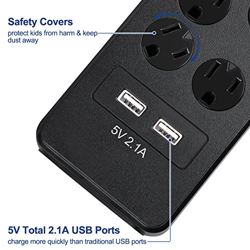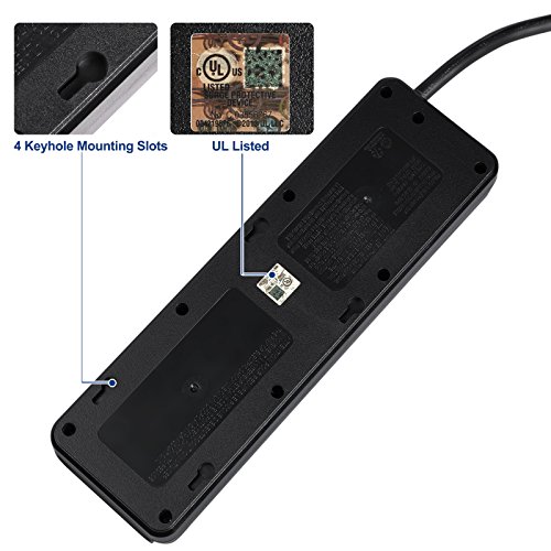 - WALL MOUNTABLE EXTENSION CORD: Keyhole mounting slots on back; 14 AWG heavy duty 6 FT long power extension cable; high quality, fire-resistant (up to 750°C) ABS shell, this black power strip surge protector with flat plug is pretty sturdy and tough; UL and FCC Certified