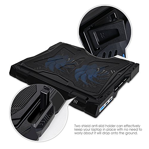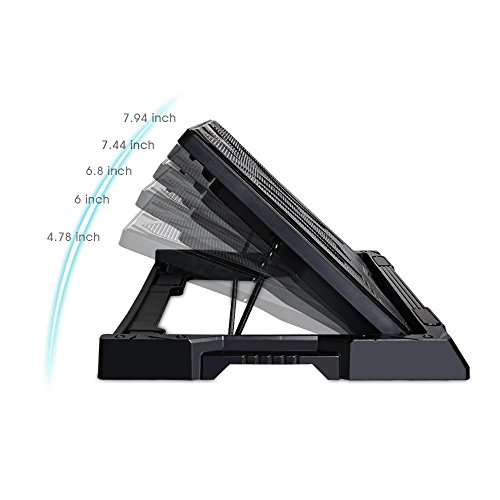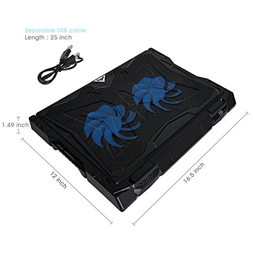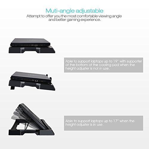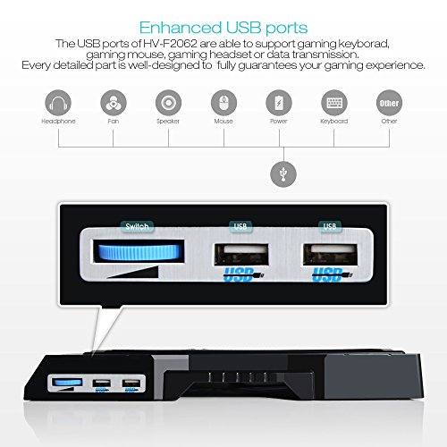 - Feature : Independent switch for wind speed can be easy to adjust or turn on/off / Havit HV-F2062 laptop cooler with 5 adjustable height settings offers you the most comfortable viewing angel when in use / Able to support laptops up to 19'' with supporter at bottom of the cooling pad when the height adjuster is not in use, and able to support laptops up to 17'' when the height adjuster is in use / Equipped with 2 shied anti-skid holder and 4 anti-skid footpads, HV-F2062 laptop cooling pad can fully protect your investment without worrying about the falling issue / 2 enhanced USB ports highly meet your demand ,not only for your notebook,but also support gaming keyboard,gaming headphone,gaming mouse or data transmission
