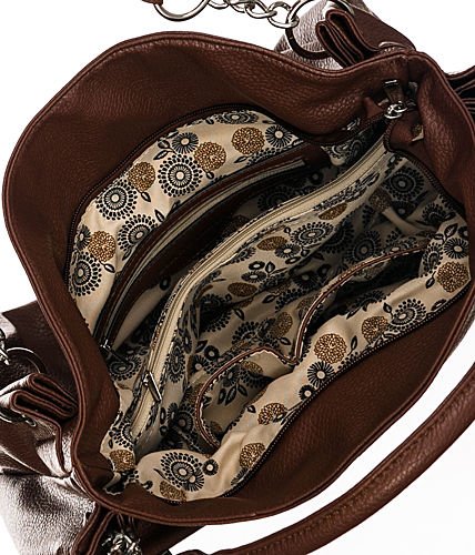-. Feature : Top zipper closure - Measures approx. 12'' Height, 16'' Length, 4'' Width / Faux leather - Silver tone metal / 1 exterior pocket - Lining: nylon / Split compartment interior - 4 pockets inside / One of the pockets is sized to hold a cell phone - Strap: 7'' drop