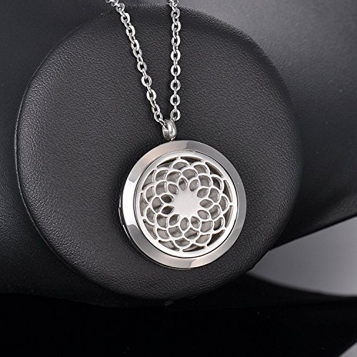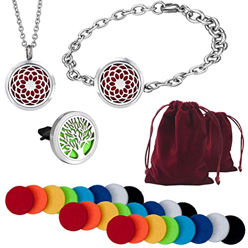 - ♥ 2 Velvet Pouches – Keep 1 for you, give 1 as a gift. Includes a 2-piece Celtic aromatherapy diffuser jewelry set - a 27-inch chain & pendant & 7-inch bracelet chain; a sunflower design on a 30mm locket. 2nd pouch - auto car vent clip, featuring a 30mm locket - a Tree of Life design. The set is artisan-crafted from hypoallergenic surgical grade 316L stainless steel for long life and durability – your essential oil diffuser jewelry won’t irritate the skin, tarnish or rust.