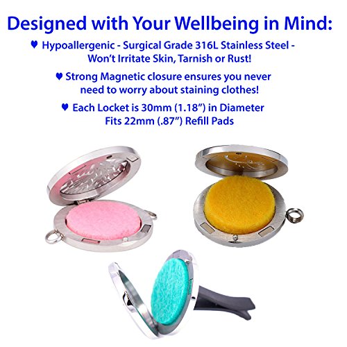 - ♥ STRONG MAGNETIC CLOSURE – Solid and smooth oil diffuser locket back (30mm in diameter) with strong magnetic closure ensures you never need to worry about staining clothes. Each necklace pad measures 3mm x 22mm for a thicker, more premium quality. Worn as both a statement jewelry piece and aromatherapy diffuser, so you can enjoy the aroma of your favorite essential oil, for up to 3 days!