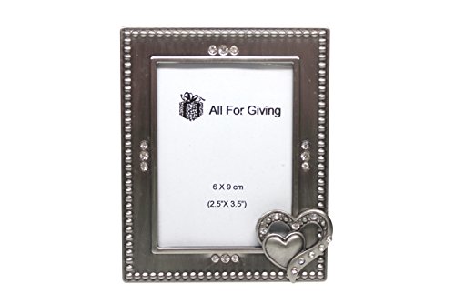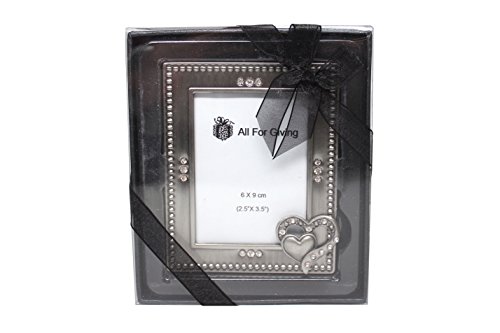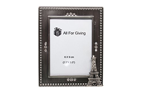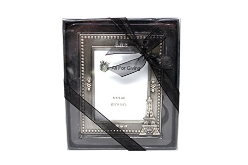 Keepsake picture frames suitable for home or office. Beautifully detailed 3D embellishments displaying a spring day in Paris. Frames are free-standing with a felt backing. Each frame is studded with clear Czech stones and finish is Pewter. Frames are 2.5" x 3.5". Each frame comes in a gift box with a clear top and black organza bow.Feature