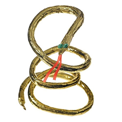 Keep a snake close to your skin for your dramatic final exit. Our Egyptian Snake Armband is made of molded gold plastic and is shaped to coil around your regal upper arm. Two green faux jewel accents give this Snake Armband its "eyes," and a soft red polyester forked tongue provides the finishing touch. Egyptian Snake Armband expands to slip on easily and is sized to fit most teens and adults.Feature