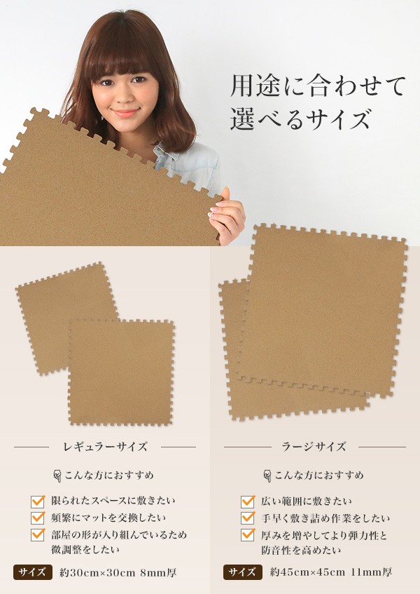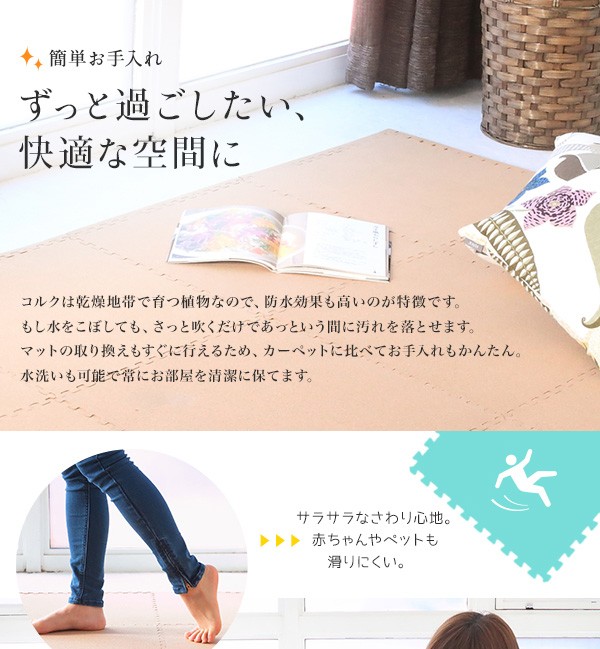 「でも、せっかく敷いたのに汚れてしまったら、、」なんて心配はご無用!!コルクは乾燥地帯に育つ植物なので、防水性が高く、簡単に水拭き・水洗いが出来るから、いつも清潔にご利用いただけます。万が一、汚れたり、破れたりしても、ジョイント式になっているから交換すれば問題なし。この30cmタイプは108枚もセットもあるので、利用場所を選びません、さらに小粒なのでつなぎ目が目立ちにくい!しかも、簡単にハサミでカットできるので、お好みの形にカットすればレイアウトも自由自在!!