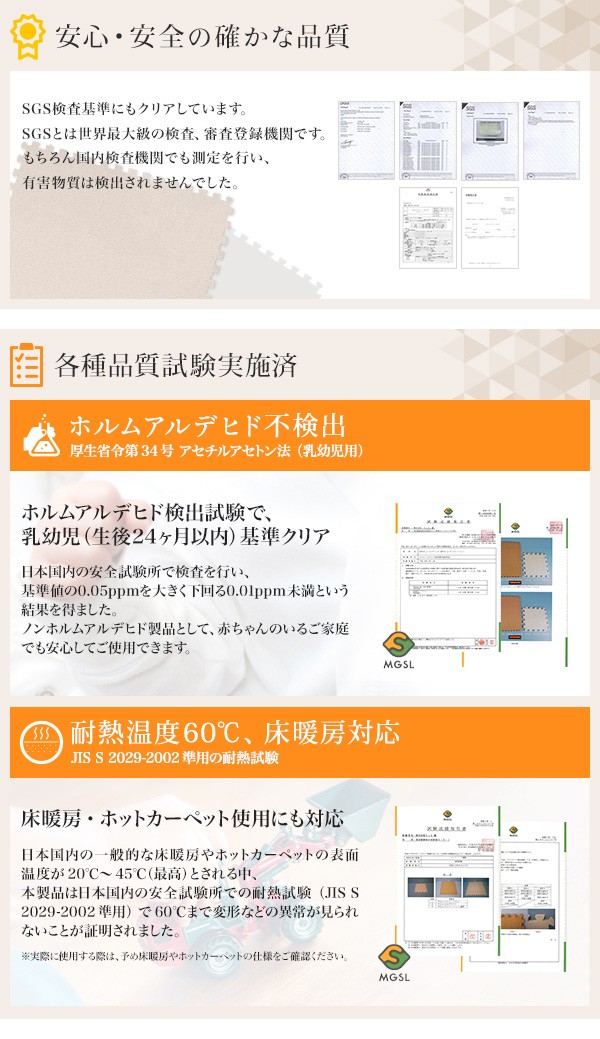 日本国内の一般的な床暖房やホットカーペットの表面温度が20℃~45℃(最高)とされる中、本製品は日本国内の安全試験所での耐熱試験(JIS S 2029-2002準用)で60℃まで変形などの異常が見られないことが証明されました。