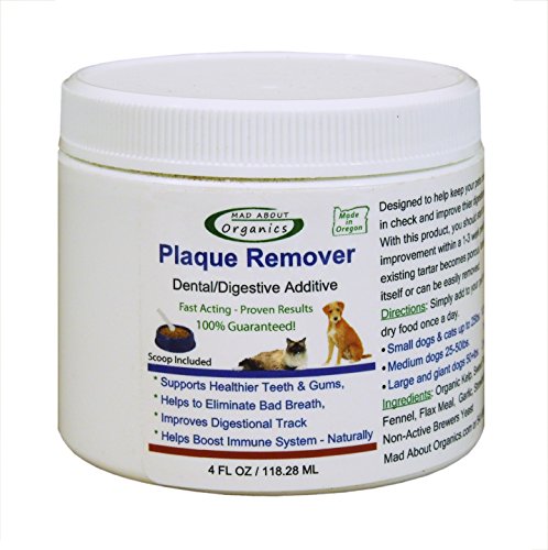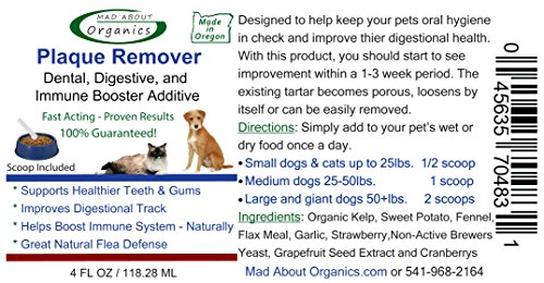 -. Binding : Misc. -. Brand : Mad About Organics -. EAN : 0045635704831 -. Feature : All-natural, no chemicals added, plaque remover food additive for dogs and cats / An easy way for those dog and cat owners to care for their pet's teeth who don't have the patience or inclination to brush their dog or cat's teeth regularly / Our Plaque Remover Food Additive does not rely on topical application or friction, the product is ingested and works systemically / The natural compound in the product comes out through the saliva and works to break down the bacterial biofilm that forms on the teeth and gums / Proudly made in Oregon, USA -. Label : Mad About Organics -. Manufacturer : Mad About Organics -. MPN : MAO-DC-PR4 -. PackageQuantity : 1 -. PartNumber : MAO-DC-PR4 -. ProductGroup : Pet Products -. ProductTypeName : PET_SUPPLIES -. Publisher : Mad About Organics -. Size : 4 oz -. Studio : Mad About Organics -. Title : Mad About Organics All Natural Dog & Cat Plaque Remover Dental Food Additive 4oz -. UPC : 045635704831