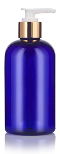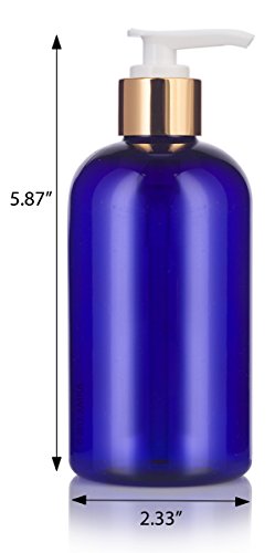 Cobalt Blue 8 oz Boston Round PET Bottles (BPA Free) with Gold Lotion Pump (6 pack) + Labels