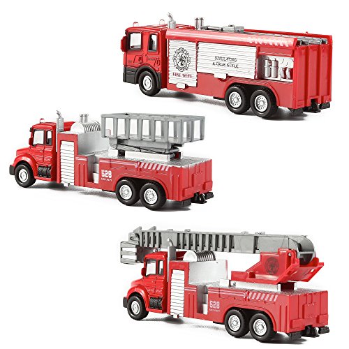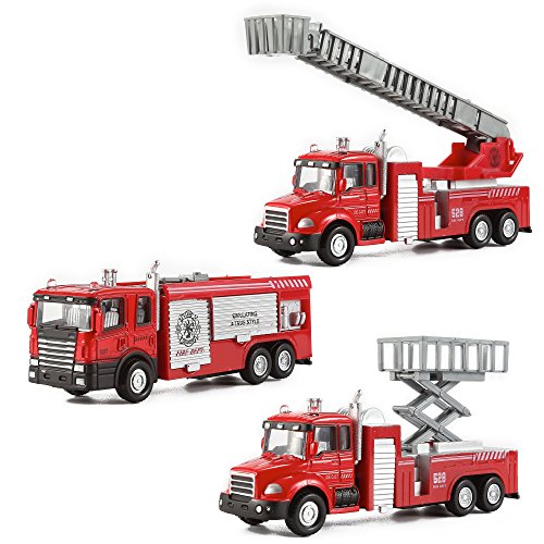 - Feature : Set of 3 Diecast Fire Trucks / Made of Diecast Metal with Plastic Parts / Pullback Friction Vehicles / Retractable Ladders and Extendable Lift / Each Vehicle Measures 6" in Length
