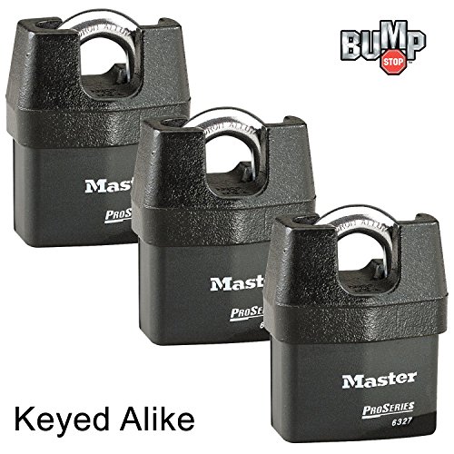 -. Brand : Master Lock -. Feature : This listing is for three (3) padlocks measuring 2-5/8" (67mm) wide with a laminated steel body for superior strength. These locks feature the BUMP STOP technology. (see explanation in the description below). / Six (6) keys are included with this 3-pack of padlocks. This style of lock is also available in a 2-pack or a 4-pack. Search 6327NKA in our store front. / Hardened boron alloy shackle for superior cut resistance. Solid iron shackle shroud resists harsh physical attacks. Dual ball bearing locking mechanism resists pulling and prying. / Removable cylinder can be replaced or repinned. 5 spool pin tumbler cylinder for added pick resistance. / If ordering multiple 3-packs we will automatically key them all the same unless told differently. Your satisfaction is assured with Master Locks Lifetime Guarantee. -. IsAutographed : 0 -. IsMemorabilia : 0 -. Label : Master Lock -. Manufacturer : Master Lock -. Model : 6327NKA-3 -. MPN : 6327NKA-3 -. PackageQuantity : 3 -. PartNumber : 6327NKA-3 -. ProductGroup : Automotive Parts and Accessories -. ProductTypeName : AUTO_ACCESSORY -. Publisher : Master Lock -. Studio : Master Lock -. Title : Master Lock Pro Series Padlock - (3) High Security Locks 6327NKA-3 w/ BumpStop Technology