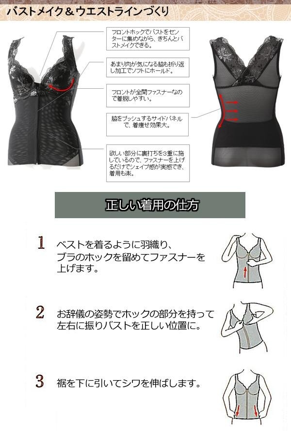 ブラジャーとキャミソールが一体型になった下着です。前ファスナーで着用も楽々♪シェイパー機能付きのキャミ部分はお腹のお肉を程よく引き締めてくれます。