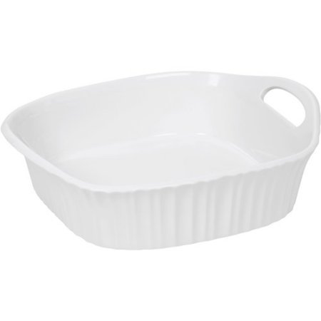 Product Description The CorningWare French White III Square Baker can go from the oven to the refrigerator to the microwave. It is made from durable stone and has a non-porous surface that will not absorb food odors or stains. This versatile yet stylish bakeware from CorningWare can be used for simple at-home meals or brought to potlucks or even dinner parties. It features a classic, fluted design with handles on both sides for easy carrying. This 8" x 8" CorningWare bakeware is as sturdy and practical as it is attractive. You can use it to cook everything from casseroles to desserts. Deep enough to handle multi-layered creations, it can even be used to freeze a one-dish meal for reheating in the oven on a busy weeknight 0