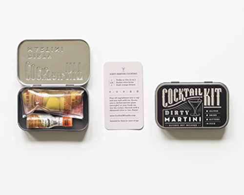 Studio : Cocktail Kits 2 Go Publisher : Cocktail Kits 2 Go Product Description Travel-friendly cocktail kit includes the premium ingredients and instructions you need to craft and enjoy two Dirty Martini cocktails anywhere. Whether you want to bring the kit with you as a carry on during your next flight, surprise your colleague with a classy gift or impress your friends with fine drinks at your next social gathering, Cocktail Kits 2 Go has you covered! The Dirty Martini drink kit includes: 1) Cocktail instructions. 2) Carry on travel tin. 3) Orange bitters. 4) Olives brine. 5) Cocktail pick. 0