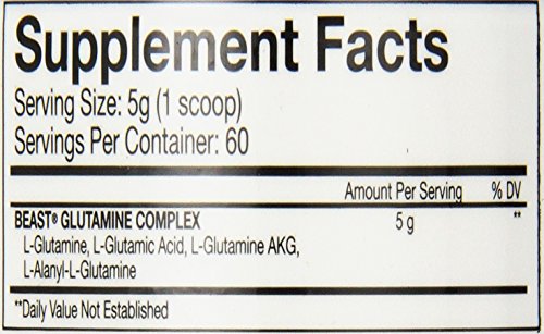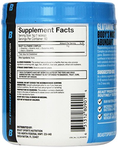 -. Binding : Health and Beauty -. Brand : Beast Sports Nutrition -. ClothingSize : One Size -. Color : Multi -. Department : unisex-adult -. EAN : 0631312809014 -. Feature : Supports muscle / Increase endurance / Supports recovery & growth -. IsAdultProduct : 0 -. Label : Beast Sports -. LegalDisclaimer : DO NOT EXCEED THE RECOMMENDED SERVING SESTION. Consult a physician P.R.Ior to use if you have any medical conditions. Do not use if you are pregnant or lactating. KEEP OUT OF REACH OF CHILDREN. -. Manufacturer : Beast Sports -. Model : 2180063 -. MPN : 2180063 -. NumberOfItems : 1 -. PackageQuantity : 1 -. PartNumber : 2180063 -. ProductGroup : Health and Beauty -. ProductTypeName : HEALTH_PERSONAL_CARE -. PublicationDate : 2015-05-24 -. Publisher : Beast Sports -. ReleaseDate : 2015-05-21 -. Size : One Size -. Studio : Beast Sports -. Title : Beast Sports Nutrition, Glutamine Complex Diet Supplement, 300 Gram -. UPC : 631312809014