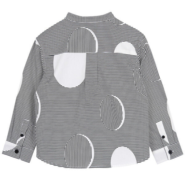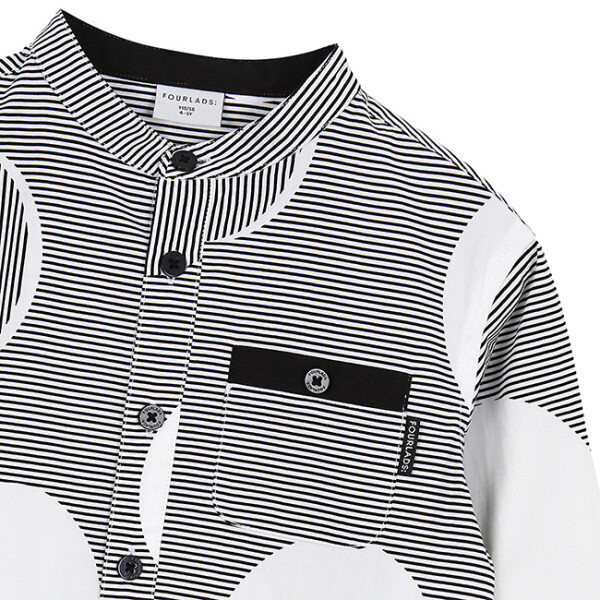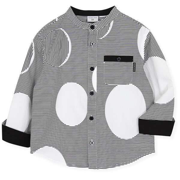 블랙 화이트 패턴에 큼지막한 도트무늬가 깨끗한 느낌을 주는 셔츠에요. 샌리넥 네크라인이 깔끔함은 물론 댄디한 스타일을 연출해준답니다. 안에 받쳐 입는 셔츠로도 입을 수 있고, 티셔츠와 매치하여 아우터처럼 입을 수 있는 활용이 좋은 셔츠에요~~