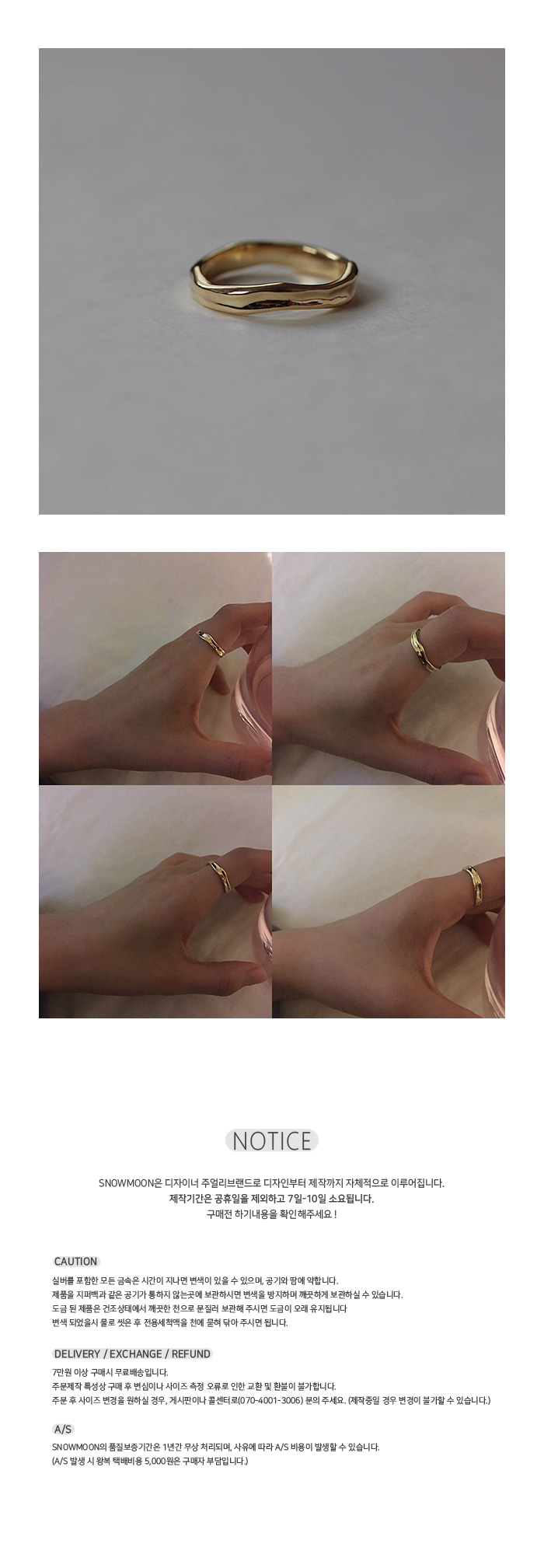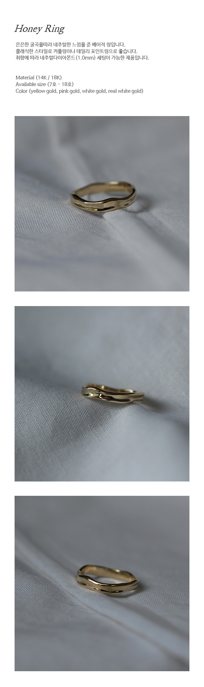 | #1 은은한 굴곡을따라 네추럴한 느낌을 준 베이직 링입니다. 클래식한 스타일로 커플링이나 데일리 포인트링으로 좋습니다. 취향에 따라 네추럴다이아몬드(1.0mm) 세팅이 가능한 제품입니다. #2 - Material (14k / 18k gold) - Available size (7호 - 18호) #3 - 구매전 product info와 하단 NOTICE를 꼭 확인해주세요! - 핸드메이드 제품 특성상 텍스처감과 형태감이 조금씩 상이할 수 있습니다. - 전체적으로 불규칙한 높이와 두께감으로 사이즈 측정 부분에 따라 오차가 있을 수 있습니다. |