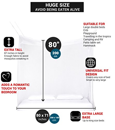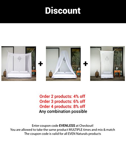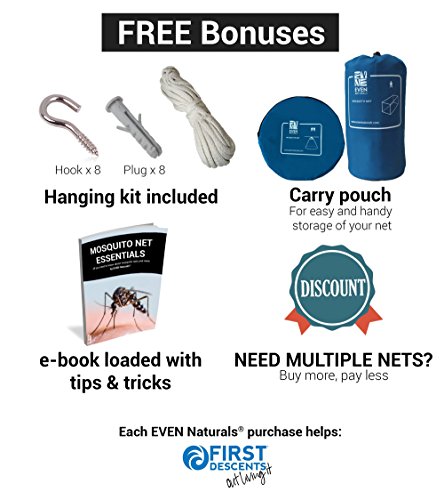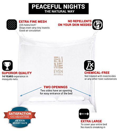 -. Feature : PEACEFUL NIGHTS THE NATURAL WAY. No more bug spray on your skin! Whether hanging the screen curtains over a queen or king canopy bed, crib or hammock, you can rest easy knowing the extra fine mesh fabric serves as a natural mosquito repellant. Allowing freedom from harsh chemicals, while providing proper air circulation and keeping out the tiniest of bugs. CUSTOMERS SAY: "Kept me from being eaten alive! And safe from ZIKA" / TWO OPENINGS, DURABLE NETTING, NON IMPREGNATED, TINIEST HOLES (225 holes/inch2). Don't be fooled by lower prices that compromise quality! EVEN Naturals® Mosquito Bed Nets are handcrafted from strong 100% multi-filament polyester REACH compliant materials, making them 100% eco-friendly. Designed for maximum resistance against bursting, each net is strong & stretchy for your comfort. / IDEAL SIZE, TWO OPENINGS FOR EASY ENTRANCE. Perfect as tent around a baby bed or covering a king bed size or any size in between, this Mosquito Net is BIGGER than most other nets (H80" x L80" x W71"), and features an opening on two sides of the bed. Additionally, when you order this net, a portion of the profits goes to charity / EASY SET UP. Our 4 or 8 points hanging system doesn't require special skills. We include a free hanging kit with 8 hooks/plugs, ropes and an eBook with tips & tricks. EVEN Naturals® mosquito tents are lightweight and machine washable, and perfect for both indoor and outdoor use. / 100% MONEY-BACK GUARANTEE. All EVEN Naturals® products come with a 1 month guarantee: if you experience ANY problems with your Mosquito Net, we refund your entire purchase. Order today and experience the EVEN Naturals® difference!