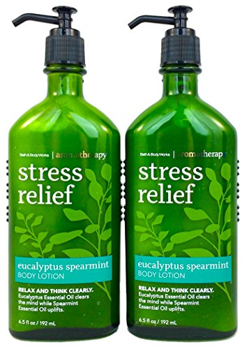 -. Feature : TWO 6.5 fl oz. Bottles / Aromatherapy Body Lotion Stress Relief - Eucalyptus Spearmint / Fragranced with essential oils and other natural fragrances / Think clearly. Eucalyptus Essential Oil clears the mind to improve concentration. Spearmint Essential Oil is uplifting and helps the mind to focus. This ultra-creamy body lotion contains Natural Soybean Oil to nourish and moisturize skin and Glycerin to attract moisture to skin.