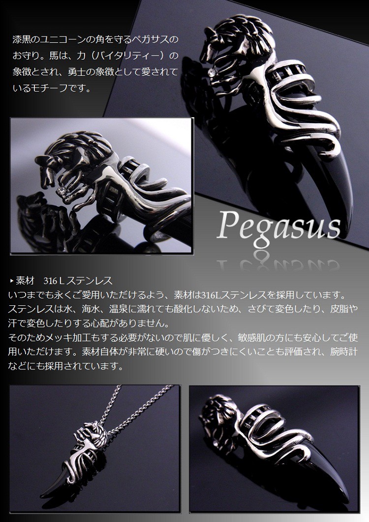 ペガサスがユニコーンの角を抱くように守る魔除けのペンダント。ステンレス×ブラックのコントラストがファッションに高級感を生みだし、キュービックジルコニアが一粒あることで、身につけると、時折光を反射して煌きます。