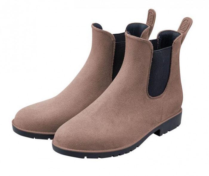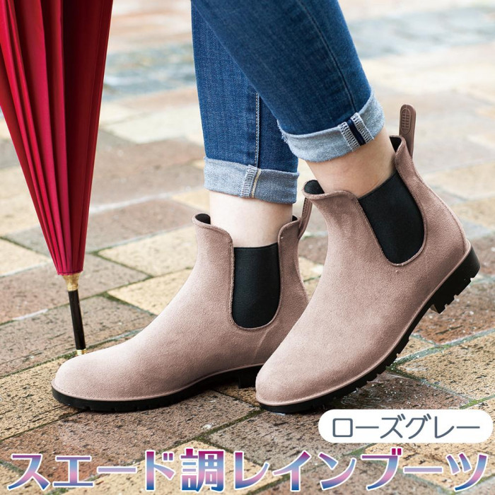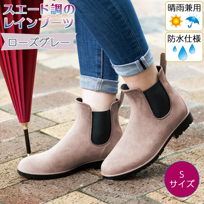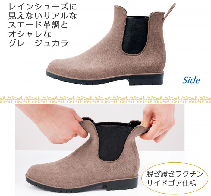| 雨の日も晴れの日も、オールシーズン履きやすいスッキリしたフォルムのショート丈レインブーツ。レインシューズに見えないリアルなスエード革調とグレージュカラーがおしゃれ。カジュアルでもお出かけでも合わせやすいデザインです。脱ぎ履きラクチンなサイドゴア仕様とプルストラップ付き。滑りにくく歩きやすいしっかりした靴底で、雪の日にも活躍します。S・M・Lの3サイズ展開です。 |