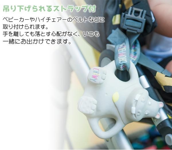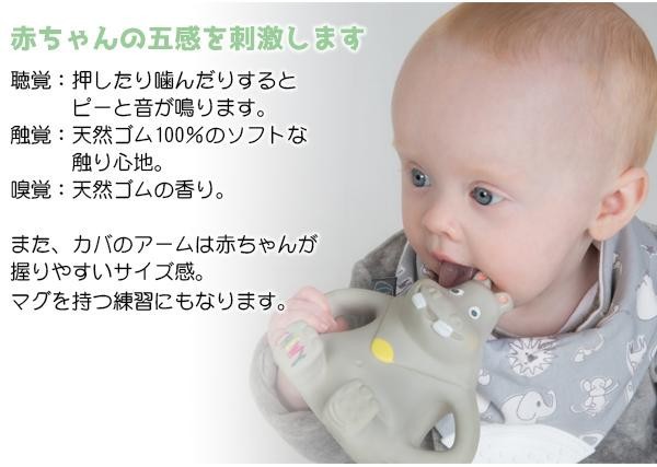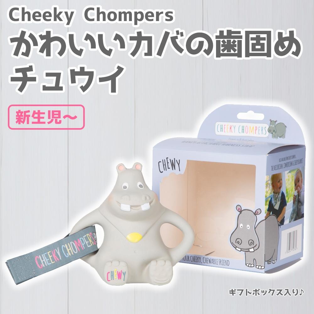 | チーキーチョンパーズ(CheekyChompers)のトレードマーク、かわいらしいカバさんが歯固めになりました♪噛む感触を楽しむことができるので、歯がかゆい時期にもぴったりです。また、押したり噛んだりするとピーと音が鳴り、聴覚を刺激します。かわいらしいボックス入りなのでギフトにもぴったりです♪ |