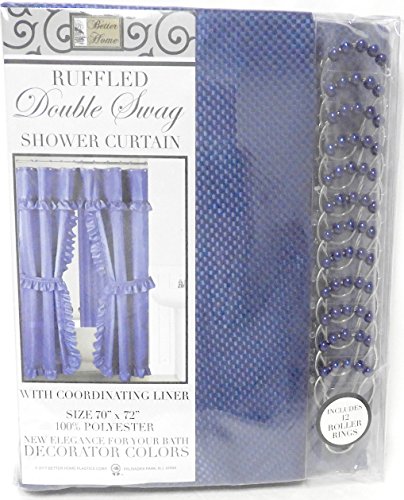 Double Swag Fabric Shower Curtain with Vinyl Liner and 12 Roller Shower Rings (Cobalt Blue)