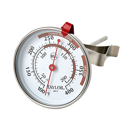 Studio : Taylor Precision Products Publisher : Taylor Precision Products Product Description This easy to read thermometer is perfect when making candy or using the deep fryer. Comes with an adjustable pan clip and is dishwasher safe.Model num;: 5911N Dishwasher safe Glass lens Range: 100° F to 400° F or 50° C to 200° C 6" stem 2.75" dial Red pointer 113547 0