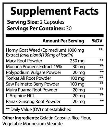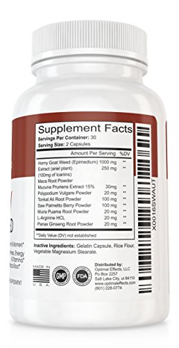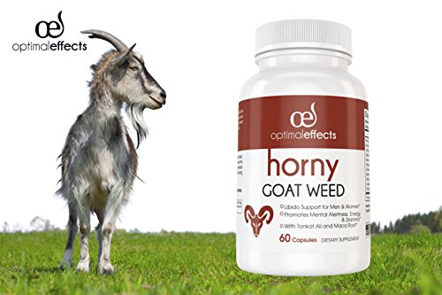 -. Feature : ALL NATURAL SAFE and EFFECTIVE Natural Horny Goat Weed FORMULA: BEST HORNY GOAT WEED SUPPLEMENT AVAILABLE! Each capsule contains 1000 mg of Horny Goat weed extract with 10 mg of icariins, a natural aphrodisiac. / CONTAINS: at least 250 mg of Maca Root Powder. Formulated to boost stamina, mental alertness, and the immune system. Mixture of 9 natural herbs to ensure you get the maximum potency. / SYNERGISTIC BLEND of NATURAL INGREDIENTS: Horny Goat Weed, Icariins, Maca Root, Tongkat Ali Powder, Saw Palmetto Berry, Muira Puama, L-Arginie HCL, Ginseng. / 60-DAY RESULTS GUARANTEE: If you are not fully satisfied and haven't experienced the benefits of Horny Goat Weed within 60-days of use than simply contact Optimal Effects directly for a full refund. Amazons worry-fee return policy allows customers to try the product for 30-Days, we offer 60. It's that simple what do you have to lose? / QUALITY ASSURED: Our manufactures are cgmp certified and follow strict standards by the USA FDA.