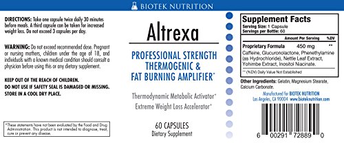 Altrexa sends fat loss and calorie burning through the roof. It shrinks the number of calories consumed by up to half using powerful appetite suppressants. With potent thermogenic ingredients, you can expect to drop up to 25 pounds a month! It should be used with extreme caution by healthy adults only, who are capable of handling its quick results and power. Altrexa is an effective fat burner for one simple reason: we've combined all of the most effective natural ingredients to boost your metabolism, help suppress your appetite and naturally curb your cravings for sweets and "junk" foods. Along with a sensible diet and moderate exercise routine you can reach your weight loss goals!