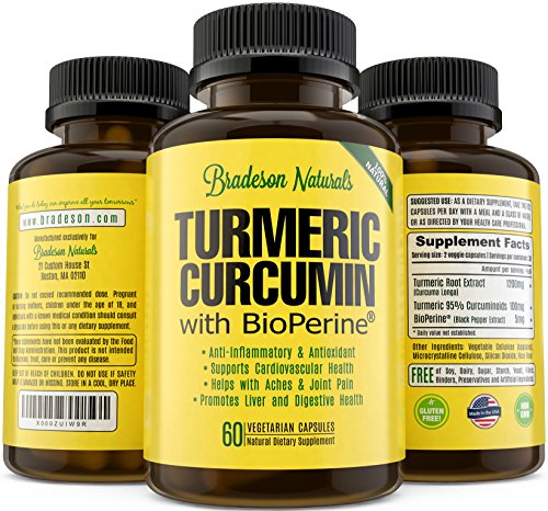 -. Binding : Health and Beauty -. Brand : Bradeson Naturals -. EAN : 0767278919808 -. Feature : 100% RISK FREE. We know we have the best formula in the market and we are proud of that. We are so confident of our products that we will refund your money if you don't feel the difference, no question asked! / GUARANTEED RESULTS. Turmeric is one of the most potent natural anti-inflammatories available. Is a natural back & joint pain reliever and helps to improve digestion and enhance your nervous system. Cucurmin is a natural antioxidant, which defends the cells of the body from injury by free radicals and stimulates the body's own antioxidant enzymes. / ENHANCED ABSORPTION. Our exclusive formula contains BioPerine®. It activates a metabolic paddle wheel, of sorts, that selectively provides a more efficient mode of nutrient transportation into the blood. / AMAZING BENEFITS. Turmeric Curcumin with BioPerine helps relief for everyday aches and pains and supports: heart health and overall circulation, liver health, focus and attention, overall brain and cognitive health, working memory and cognitive performance. / 100% NATURAL TURMERIC. Bradeson Naturals only uses 100% GMO-FREE AND 100% natural ingredients in veggie capsules. No artificial ingredients, no binders, no fillers, no gluten, no wheat, no dairy, no sugar, no soy, no starch, no hormones. You'll only get the ingredients you need! All our supplements are 100% MADE IN THE USA in an FDA Inspected facility, NSF and CMF Certified. -. IsAdultProduct : 0 -. Label : Bradeson Naturals -. LegalDisclaimer : These statements have not been evaluated by the Food and Drug Administration. This product is not intended to diagnose, treat, cure, or prevent any disease. -. Manufacturer : Bradeson Naturals -. MPN : 767278919808 -. PackageQuantity : 1 -. PartNumber : 767278919808 -. ProductGroup : Health and Beauty -. ProductTypeName : HEALTH_PERSONAL_CARE -. Publisher : Bradeson Naturals -. Studio : Bradeson Naturals -. Title : Turmeric Curcumin Supplement with Bioperine® (Black Pepper For Superior Absorption and Bio-availability). 100% All Natural Anti Inflammatory & Anti Oxidant. Non-GMO, Gluten Free, Made in the USA -. UPC : 767278919808