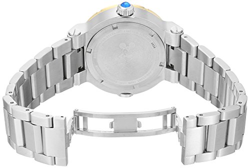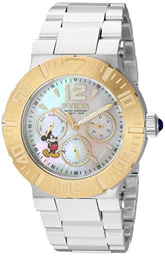 Invicta 24498 Disney Limited Edition women's watch features a 40mm wide solid stainless steel case with a unidirectional rotating gold tone bezel and textured push-pull crown. Invicta 24498 is powered by Japanese TMI VH63 quartz movement. This beautiful watch also features a Mickey mouse printed white mother of pearl dial with white accents gold tone luminous hands and index hour markers along with the 12/24-hour time and day-date display functions, scratch resistant flame fusion crystal and water resistant to 100 meters. Invicta 24498 is equipped with a 24mm wide solid stainless steel bracelet with a double deployment clasp. Invicta 24498 women's Disney white MOP dial steel bracelet day date watch is brand new and comes in an original Invicta gift box and is backed by a 5 year limited warranty.Feature