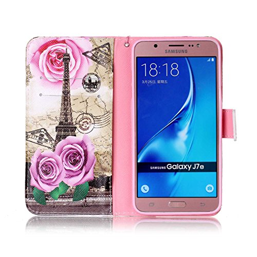 Galaxy J7 2016 Case,Galaxy J7 2016 Cover,ikasus Colorful Art Painted PU Leather Fold Flip Wallet Case Cover Stand Card Slots Protective Case Cover for Samsung Galaxy J7 (2016),Flower Rose Eiffel Tower
