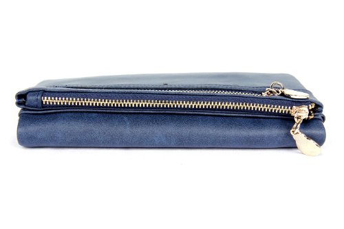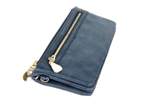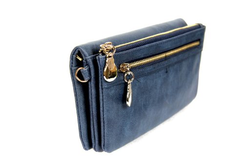 This wallet includes a strap if you wish to use it as a small purse. The open side of the wallet faces downward, and is shut with a metal snap. On the top side, where the strap is, there are two zippered pockets for quick access. The classy design and beautiful color look sharp for any outfit and occasion. With plenty of room inside and outside, this 2 fold wallet purse is very fashionable.